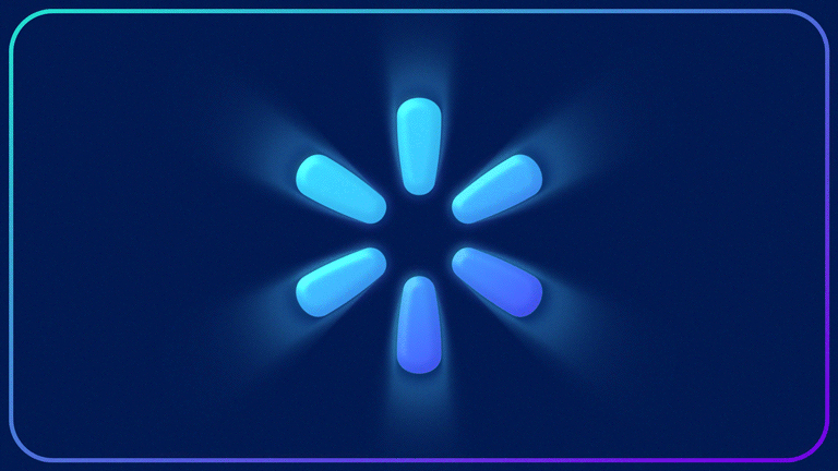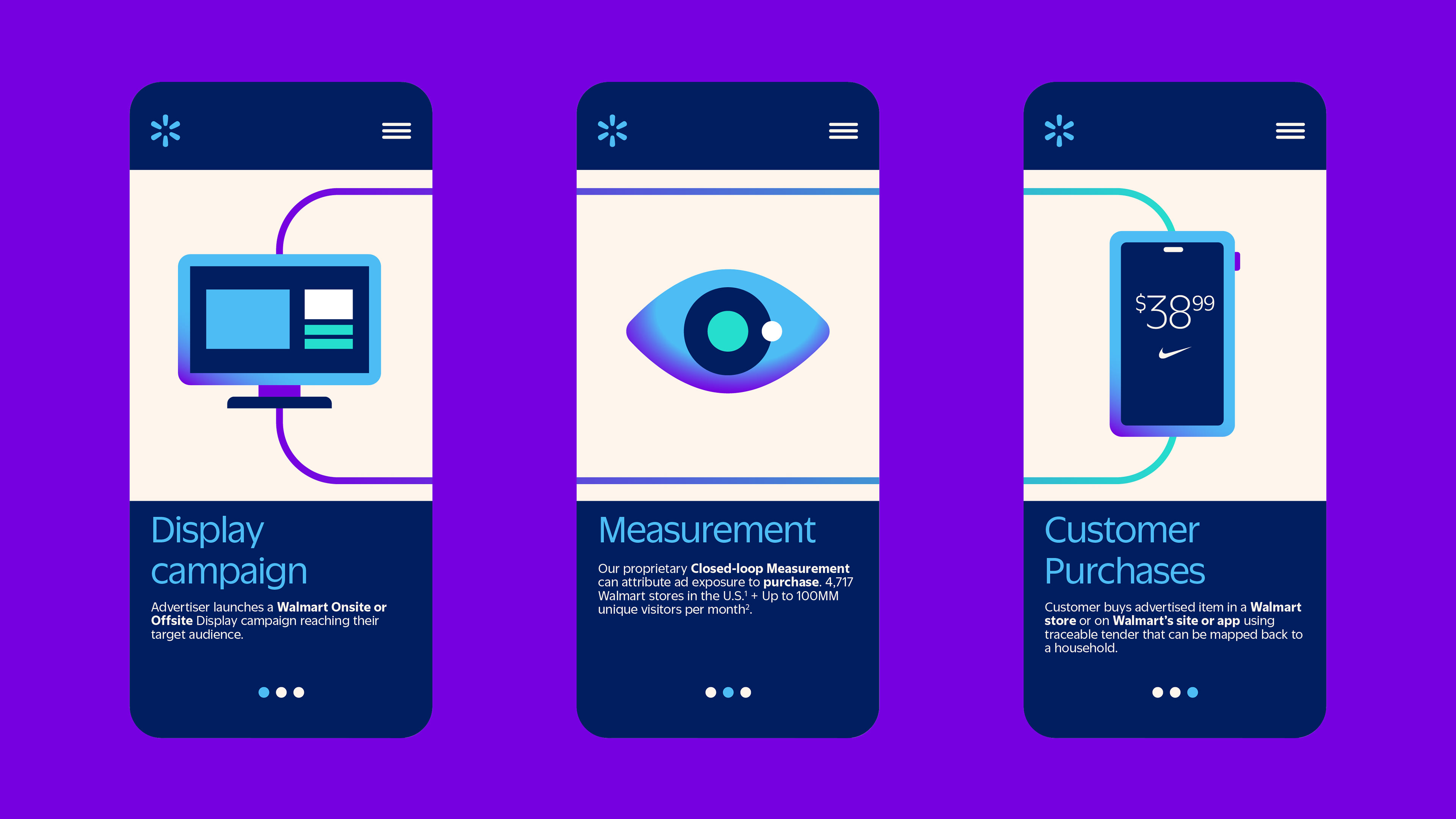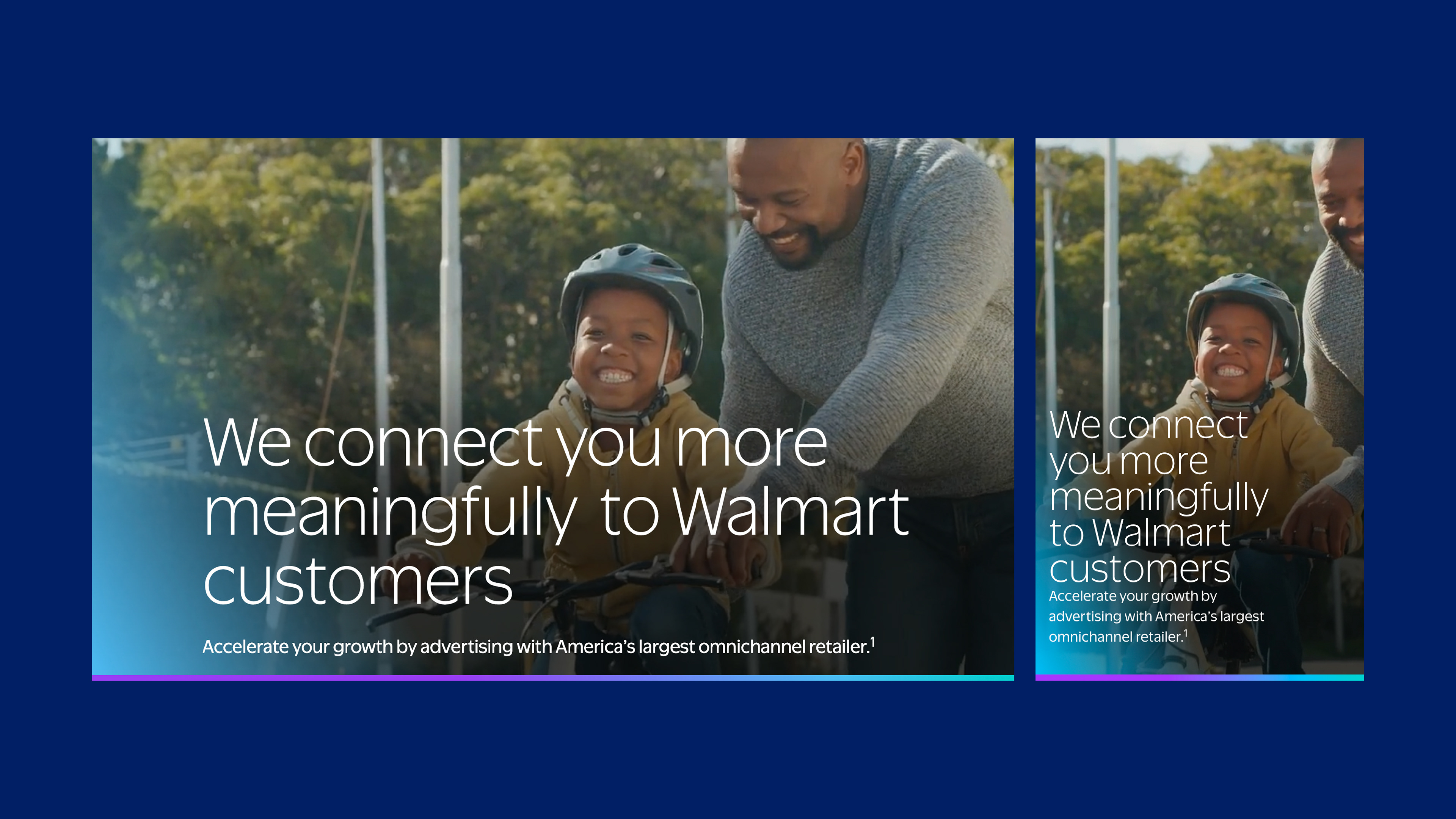 The visual update within the new Walmart branding emphasizes connection via a linear gradient frame device referencing screens. From the glow on photography and within typography, the graphic system uses color in vivid ways to speak to rich advertising media and other content engagement topics related to retail and connecting to prospective Walmart shoppers.